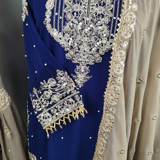 Grey and Navy Blue Georgette Heavy Work Designer Party Wear Suit