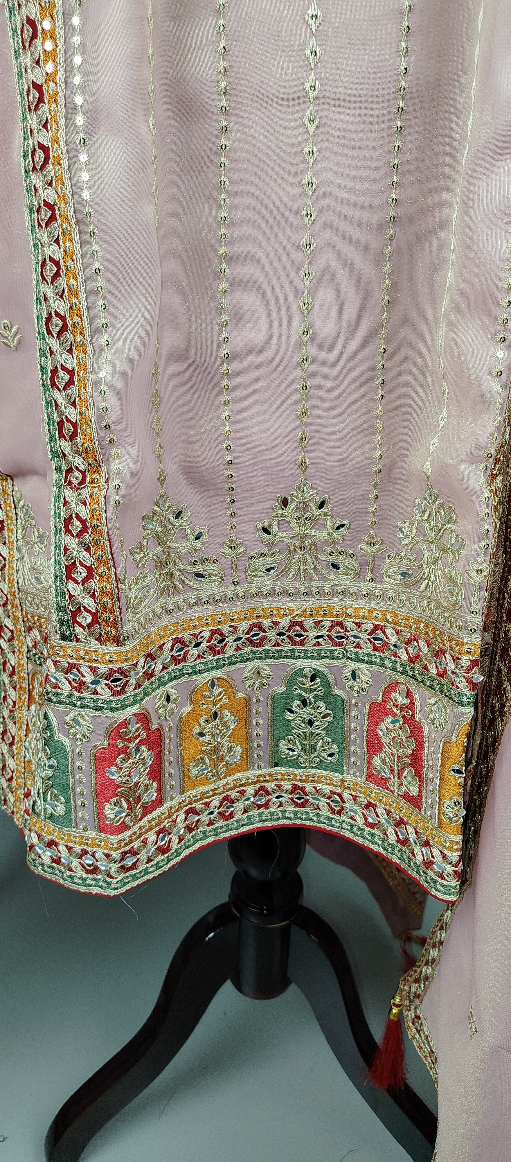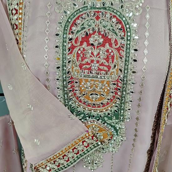 This designer party wear suit features intricate zari embroidery and mirror work on a shimmering light pink organza fabric. Its elegant design and impeccable craftsmanship make it the perfect choice for special occasions. Elevate your style and make a statement with this stunning piece.